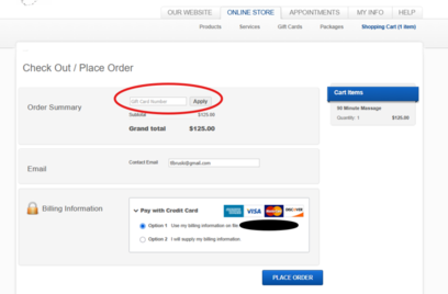 Please go to our online site, schedule a massage, once in the CHECK OUT/ORDER page enter your GIFT CERTIFICATE number in the box above the payment area. Not to be confused with the pop-up window asking for credit card info. PROMO CODES are before the checkout page, in your SHOPPING CART screen. Gift Certificates and promo codes cannot be redeemed on the MindBody phone app.